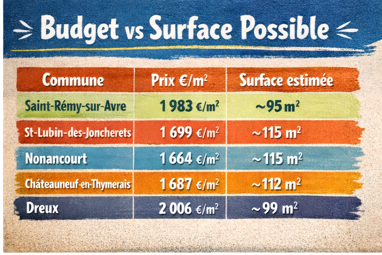 | saint-lubin-des-joncherets | 1 699 | 105,9 m² | 111,8 m² | 117,7 m² | plus de m² pour le prix, bon compromis |